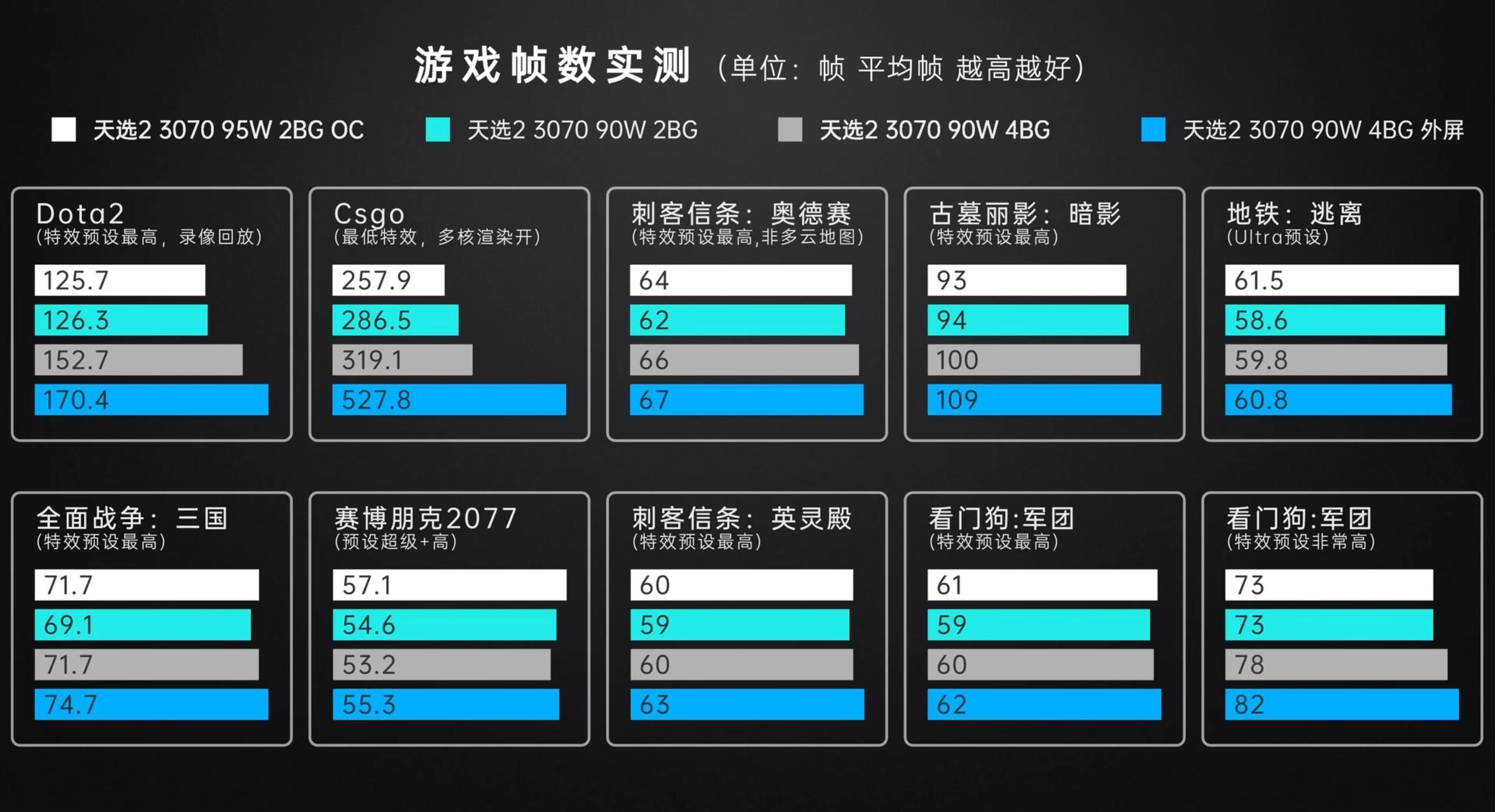 但是伴随着集成电路制造工艺的突飞猛进,以往由集成显卡为显示器输出信号流的方案已经不能为广大笔记本使用者所接受,所以独显直连技术又重新登上了笔记本市场的主舞台。为更好地展示出独显直连模式对于电脑性能的提升,我们以天选 2 为例:当天选 2 使用自带的屏幕时,其工作模式为独显计算,集显输出的混合模式;当天选 2 外接屏幕时,其独立显卡得以直接为显示设备输出信号流,等效于开启了独显直连。表明,天选 2 在独显直连模式下的游戏帧率都有不同程度上的提升,而对于一些对处理器性能有一定要求的游戏,这样的提升甚至几乎是翻倍的。