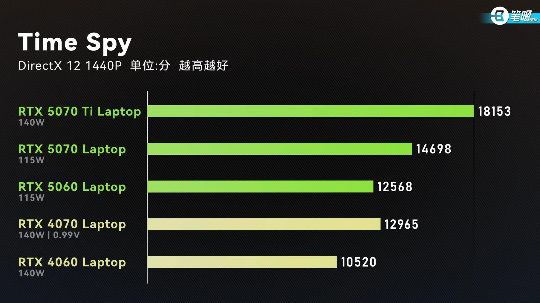 RTX50 及 RTX40 系列主流独立显卡性能对比,以 Time Spy 为例综上,我们一般建议同学你选购搭载 RTX5070Ti 及以下显卡配置的产品,当然,如果同学你履丝曳缟,选择搭载 RTX5080 甚至 RTX5090 的笔记本产品也并非不可。只是,在这种预算条件下,组装一台搭载 RTX5070Ti、RX9070(XT) 或更高显卡配置的台式电脑会明显更为合适。