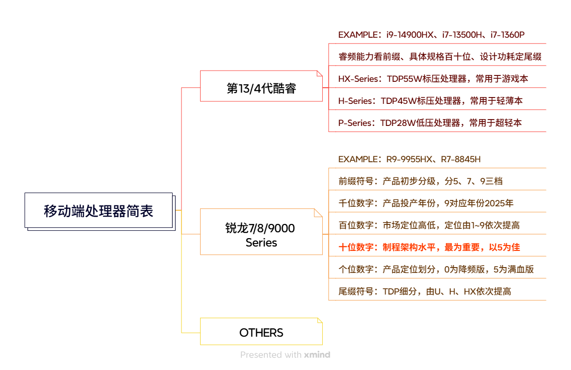 处理器的型号对应着该处理器的代数、核心数以及散热设计功耗等诸多重要信息,是同学你在选择电脑时参考的一项重要参数。虽然当今的移动端处理器已经可以轻松满足绝大多数用户的需要,但是其中也不乏一些暗坑,容易使同学多出一笔不必要的开支。我们注意到,去年市场上主要流行的移动端处理器为 Intel 酷睿 Ultra2 代处理器、第 14 代酷睿处理器和 AMD Ryzen AI 处理器、锐龙 9000(7000)系列处理器,其简要信息可参考下图: