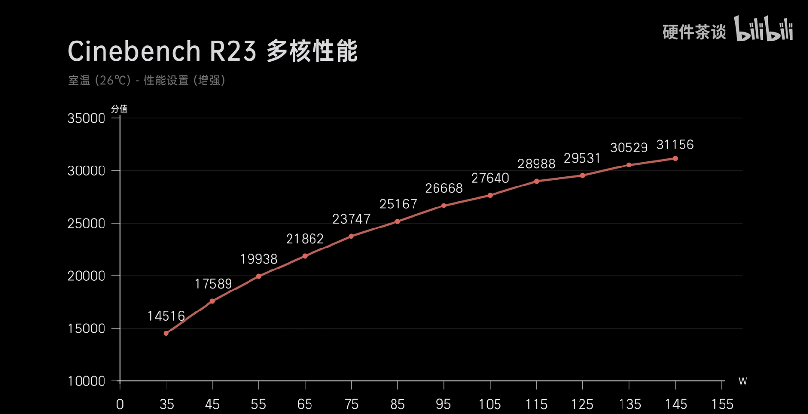i9-13980HX 处理器的能耗曲线,以 Cinebench R23 为例利用回归方程分析上图可知:在 35W 至 55W 的区间内,每提高 10W 性能释放,i9-13980HX 的成绩都会大幅提高约 2700 分;而在 55W 至 75W 的区间内,每提高 10W 的性能释放,i9-13980HX 的成绩可以提高约 1900 分;即便在 75W 至 115W 的区间内,每提高 10W 的性能释放,i9-13980HX 仍可以提高约 1300 分;可当 i9-13980HX 的功耗超过 115W 时,功耗的提高对其性能的提高贡献已极小。